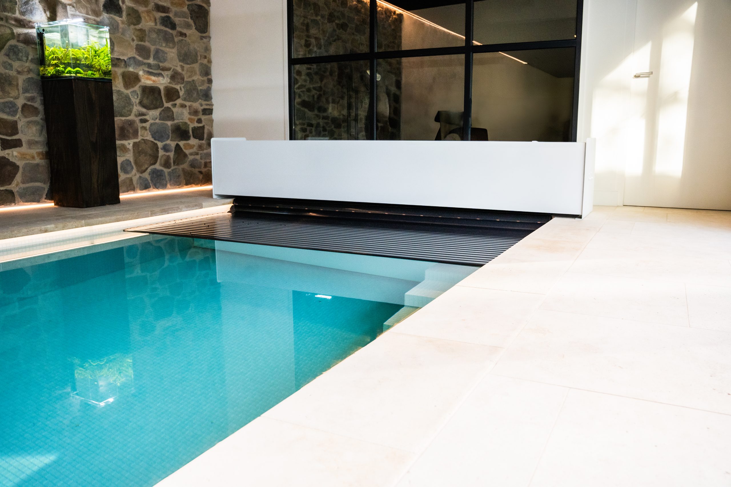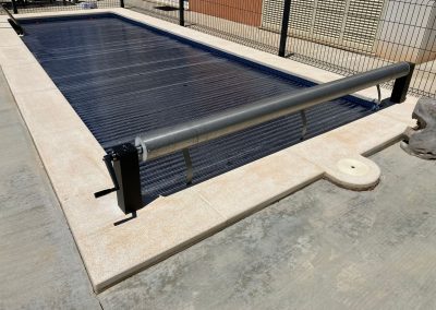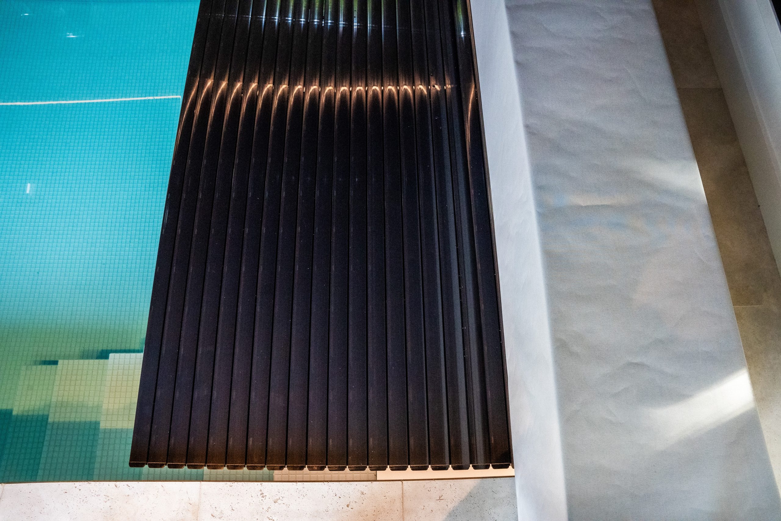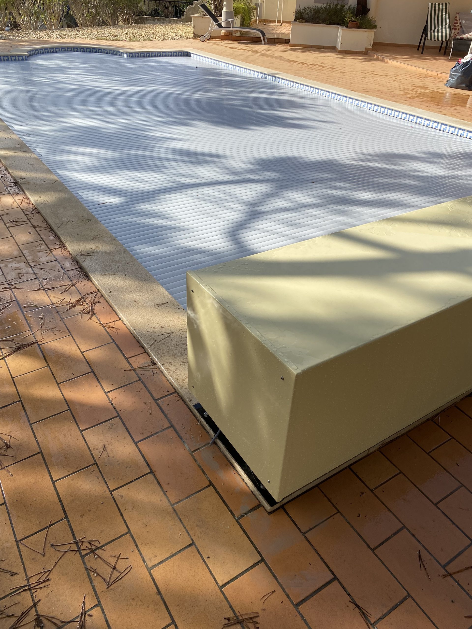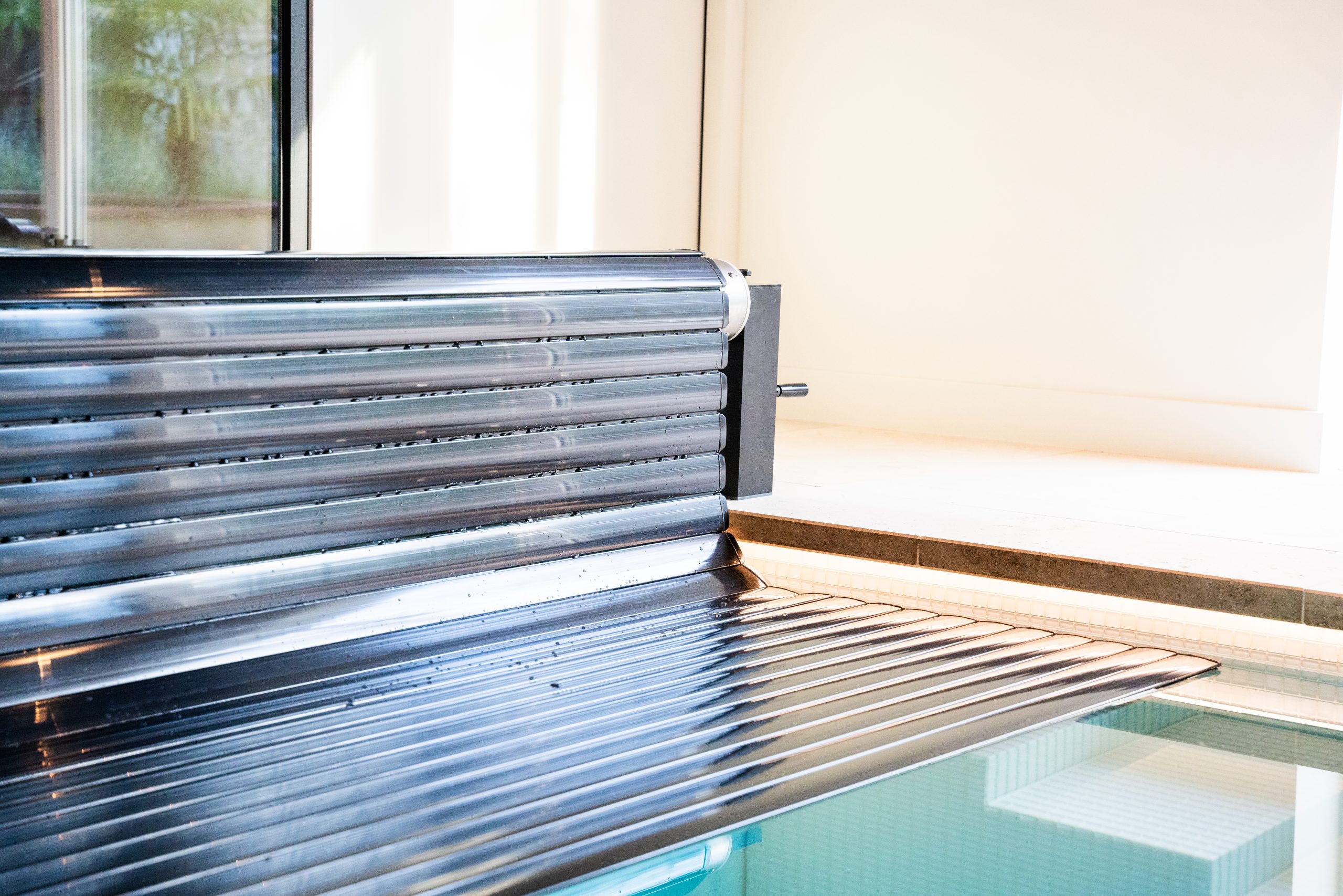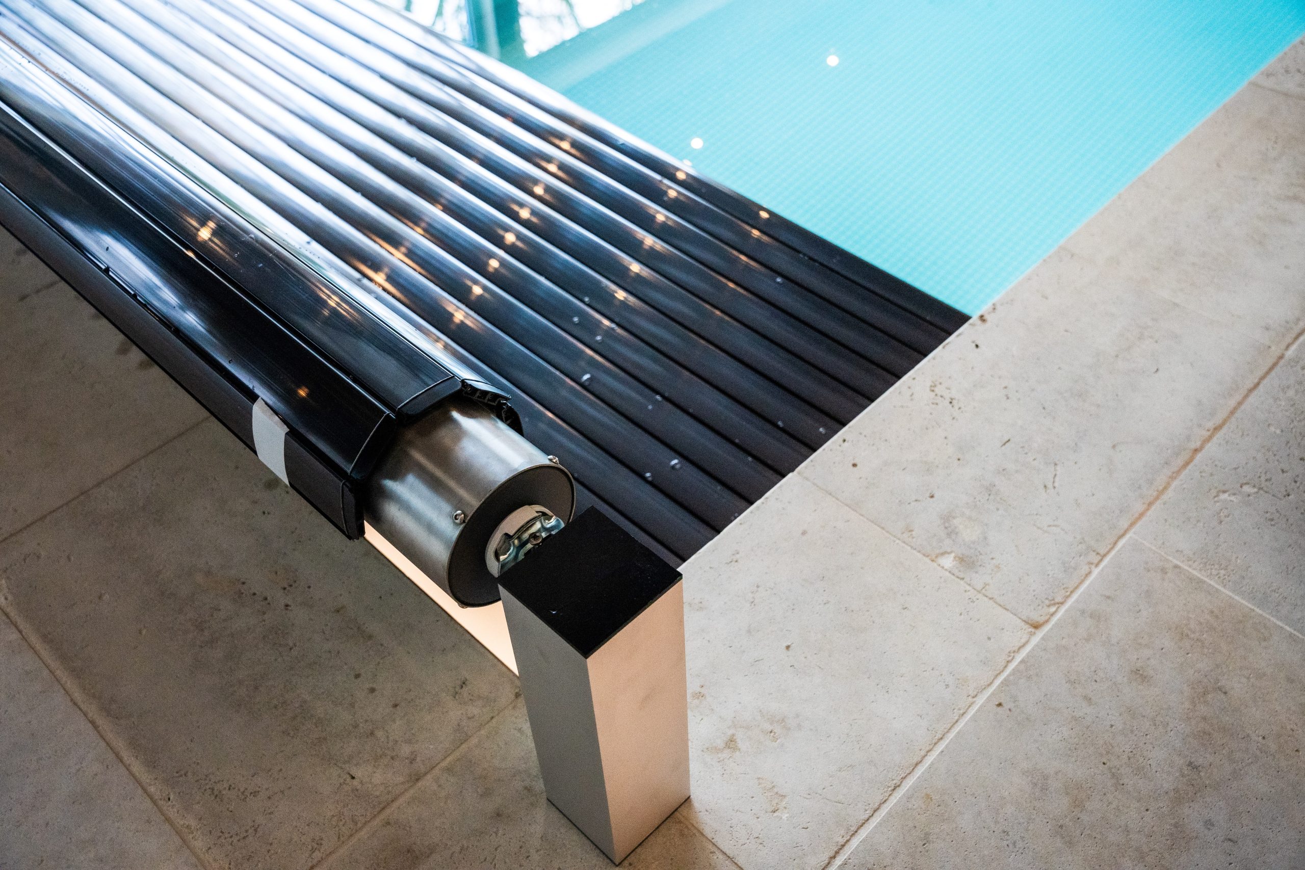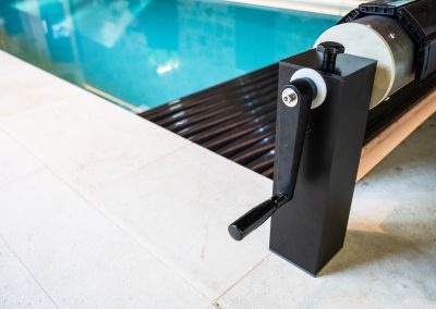 Met dit systeem rol je de lamellen eenvoudig op of af met slechts één druk op de knop. Het solide ontwerp zorgt ervoor dat de lamellen netjes uit het zicht verdwijnen, in de omkasting welke achteraan het zwembad wordt geïnstalleerd. De bovenzijde van de omkasting is makkelijk te verwijderen voor onderhoud of het schoonmaken van de zwembadlamellen.